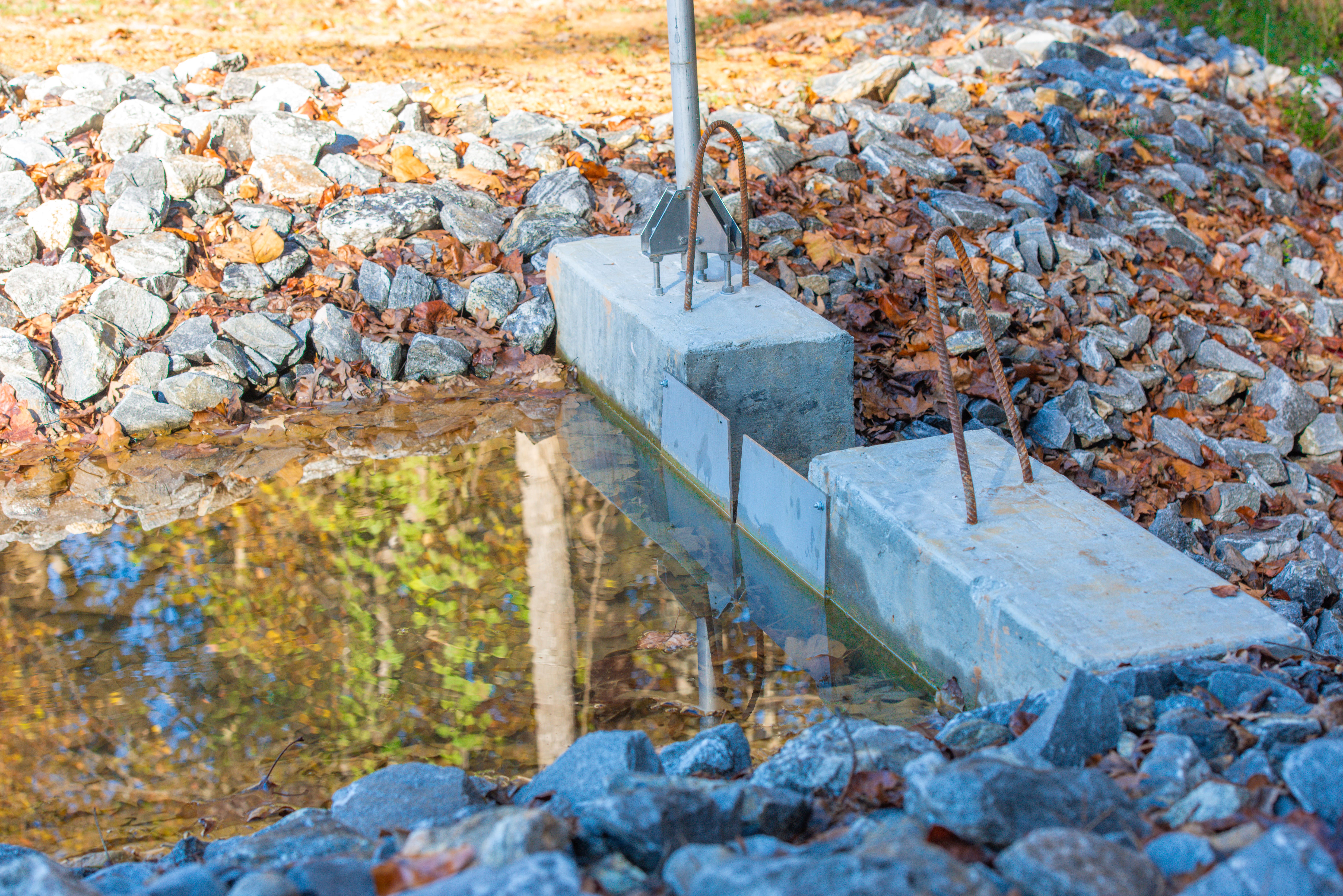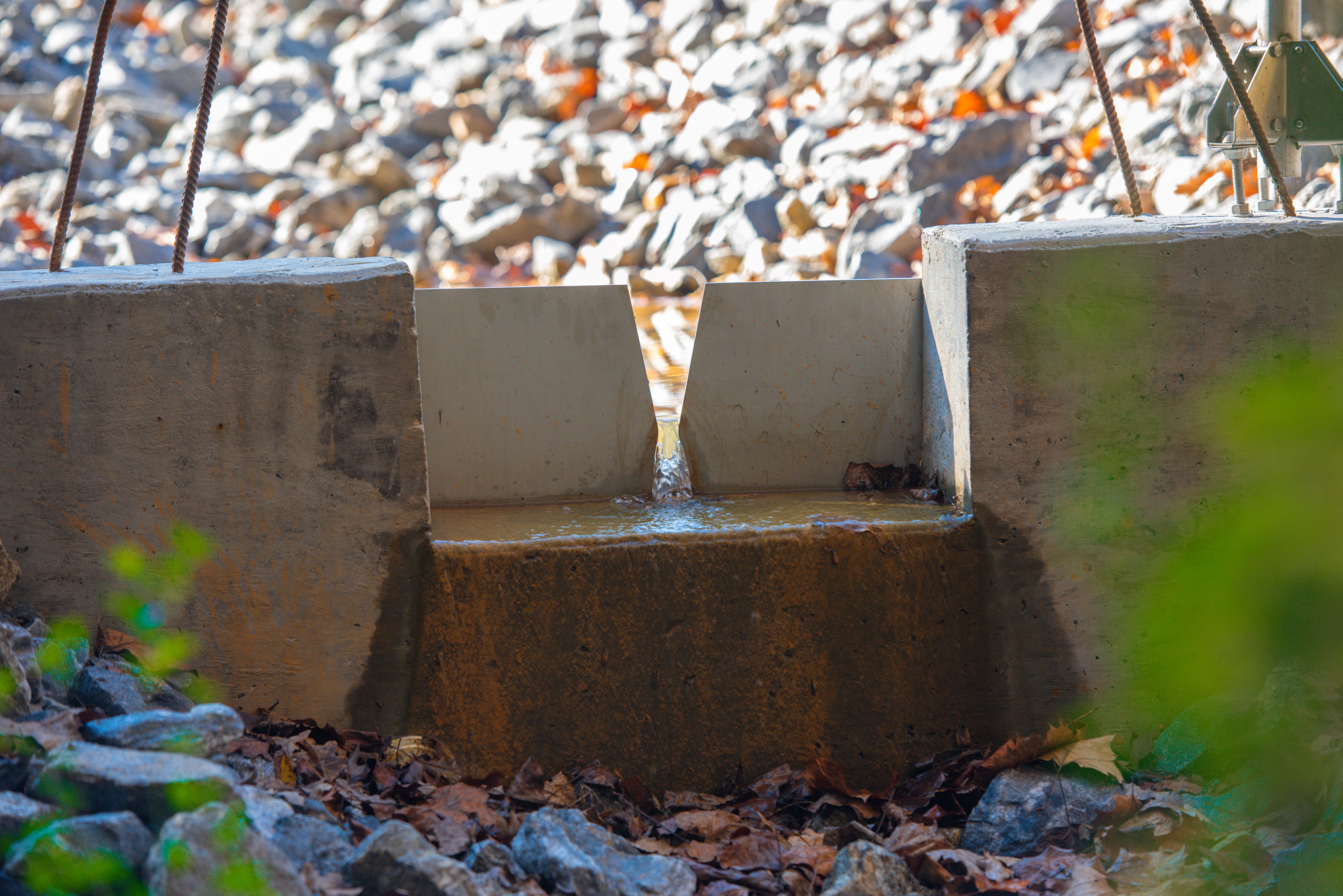 A weir, which resembles a miniature dam, is used to manage and monitor water flow. Using design specifications from dam safety engineers, the Facilities team built a custom mold and poured the concrete structure in-house.